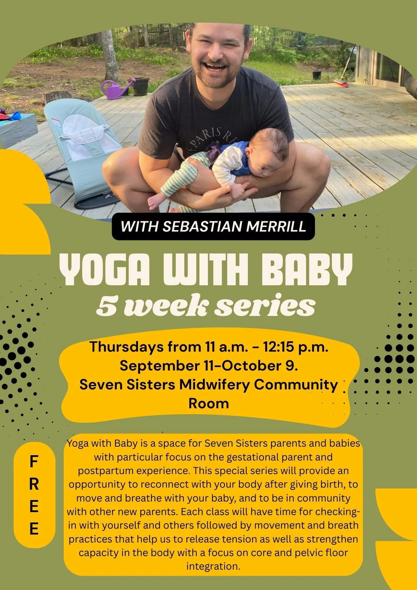 Yoga with BabyYoga with Baby is a space for parents and babies with particular focus on the gestational parent and postpartum experience. This special series will provide an opportunity to reconnect with your body after giving birth, to move and breathe with your baby, and to be in community with other new parents. Each class will have time for checking-in with yourself and others followed by movement and breath practices that help us to release tension as well as strengthen capacity in the body with a focus on core and pelvic floor integration. When: Five-week series: Thursdays from 11 a.m. - 12:15 p.m. September 11-October 9. You are welcome to come to every class in the series or just drop in when it works for your schedule. Where: Seven Sisters Midwifery & Community Birth Center Community Room